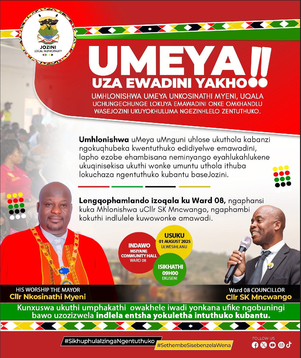 Honourable Mayor Nkosinathi Scelo Myeni of the IFP was sworn in on 16 May 2025 to serve for the remainder of the current term