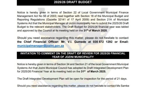 Read more »His Worship, Cllr Nkosinathi Myeni, has tabled his first Draft Integrated Development Plan (IDP) and Budget as the Mayor of…
