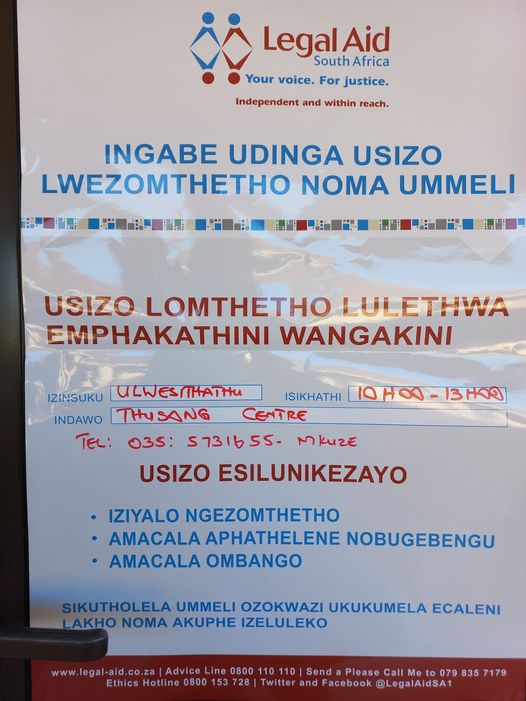 Legal Aid will be available for the following days at the Jozini Thusong Center from 09h00am to 13h00 noon.